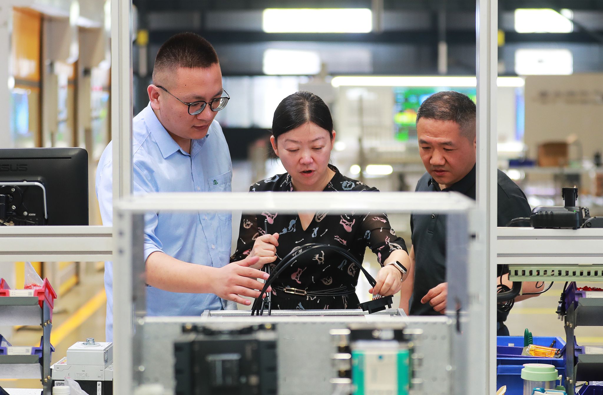 在江苏大全集团低压成套电气生产车间,完美官方端入口计算机科学与通信工程学院教师宋雪桦(中)、金华(右)与企业技术人员交流基于AI的自动化生产线检测技术。